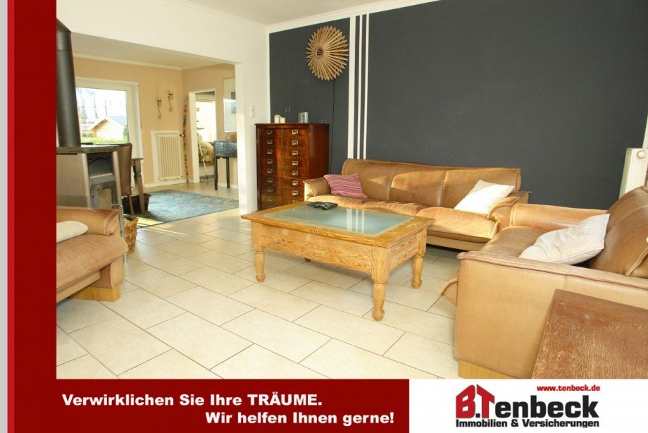 Erdgeschoss: Wohn-/ Esszimmer mit Kaminofen, Küche, Diele, Gäste-WC, sonnige Terrasse